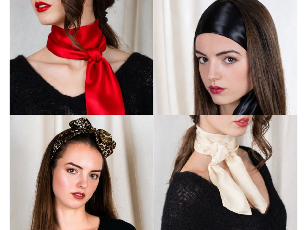Luxusní hedvábný šátek – vlasy i krk v elegantním stylu.
